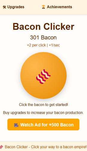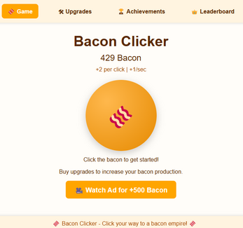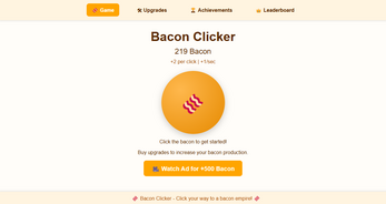 Click, cook, and collect bacon! Upgrade your tools, unlock achievements, and become the ultimate bacon tycoon in this addictive idle clicker game.
